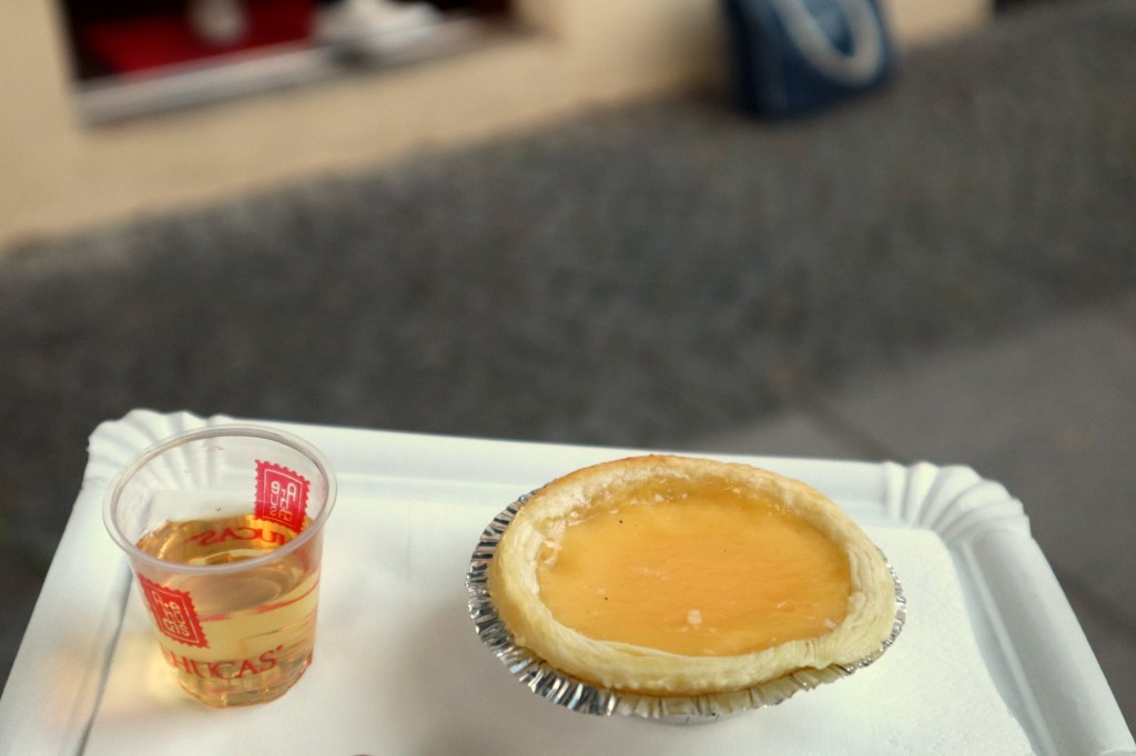 Entsprechend bekommen wir einen Vinho do Porto eingeschenkt. Dazu gibt es Pastéis de Nata – typisch portugiesische Blätterteigtörtchen mit einer Art Puddingfüllung.